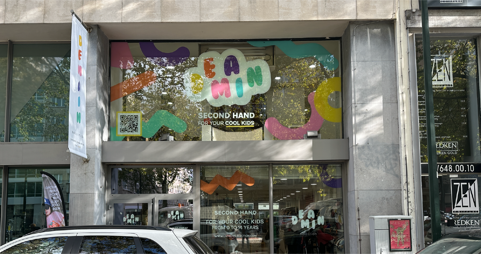 Pour Demain, une société fondée par deux jeunes entrepreneurs et installée sur l’Avenue Louise, nous avons été sollicités pour concevoir l’univers graphique de leur magasin. Notre mission : créer une vitrine forte et impactante, capable d’attirer l’œil sur cette artère emblématique de Bruxelles. Nous avons développé un univers visuel basé sur des formes organiques et des couleurs vives, évoquant à la fois le dynamisme de la marque et son ancrage dans l’univers de l’enfance. Le projet a couvert l’ensemble de la façade : aussi bien la partie inférieure que l’étage supérieur, permettant de maximiser la visibilité depuis les deux directions de circulation. Le logo, déjà existant, a servi de point de départ. Nous avons donc conçu une continuité graphique qui enrichit et prolonge l’identité initiale, tout en lui donnant une nouvelle cohérence. Le résultat : un habillage coloré, ludique et immédiatement reconnaissable, qui a pleinement satisfait le client.