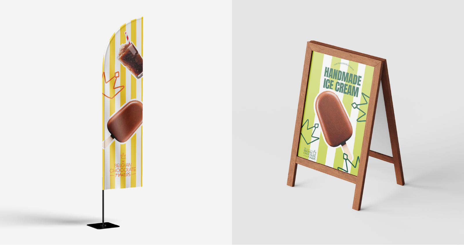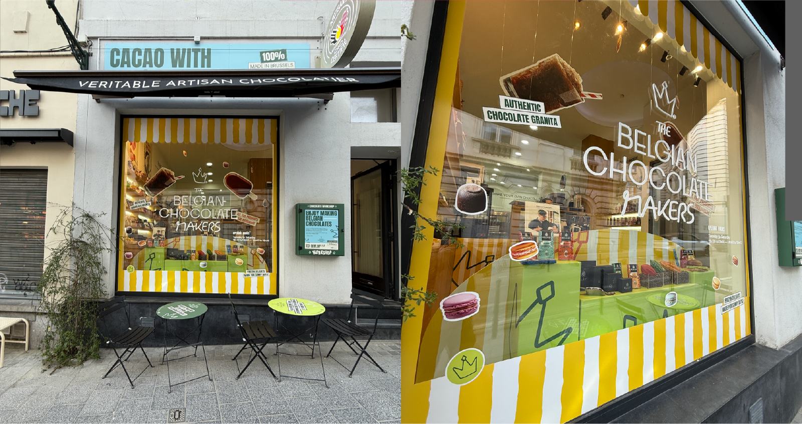 Pour la seconde collaboration avec The Belgian Chocolate Makers, dans leur boutique de la rue de Namur, nous avons imaginé une vitrine entièrement dédiée à l’univers estival. Après une première réalisation hivernale, il s’agissait cette fois de plonger les passants dans une atmosphère plage, soleil et boissons fraîches, tout en mettant en valeur les créations chocolatées de la maison. L’un des enjeux majeurs de ce projet a été la conception d’un véritable étalage. Le client ne disposait initialement d’aucun support de présentation : nous avons donc créé, à partir de zéro, un système de blocs modulables, customisés pour l’hiver puis transformés et recolorés pour l’été. Ces modules, intégrés à la scénographie de la vitrine, ont apporté une dimension supplémentaire et une réelle valeur ajoutée au point de vente. Comme pour chacune de nos vitrines, tous les visuels ont été dessinés à la main par notre équipe, afin de garantir une identité unique et impactante. Le résultat : une vitrine immersive, ludique et colorée qui a captivé le regard des passants. Impact direct : une hausse de plus de 30 % du chiffre d’affaires, une visibilité accrue et un univers différenciant qui a marqué l’identité du magasin.